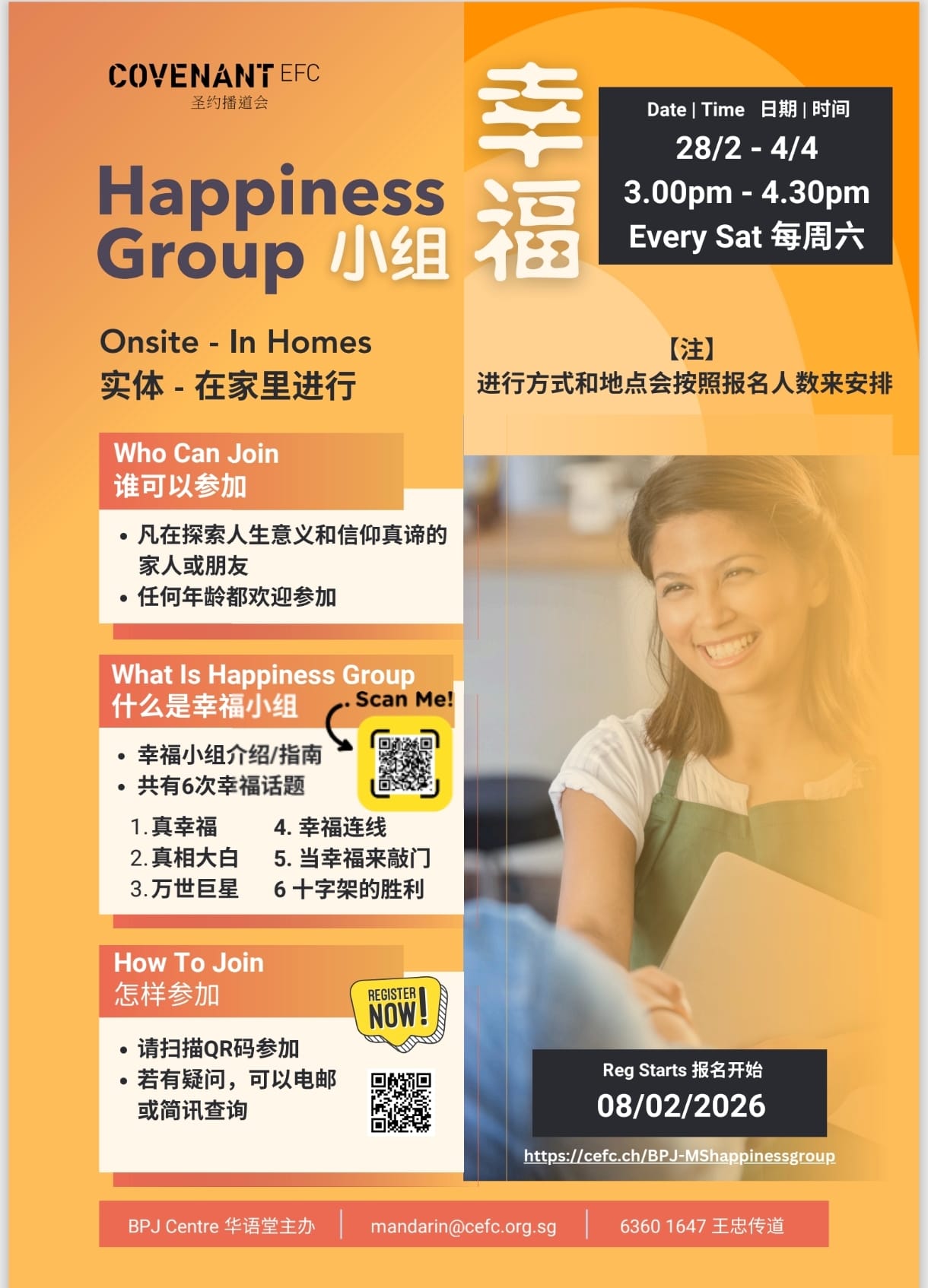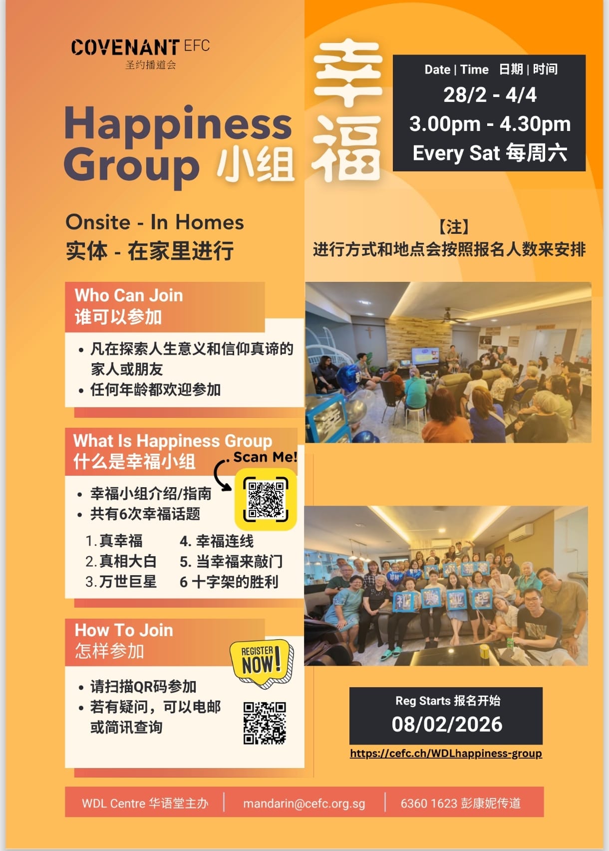 什么是幸福小组?来参加,就晓得! 我们邀请的对象是讲华语和还未信耶稣的家人,朋友等(BEST)。我们将会有6周的活动如破冰游戏,好歌和故事分享。让我们一起幸福吧!今天就邀请您的朋友报名参加!